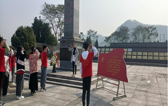 首先,王蓓老师向员工介绍羊楼洞烈士陵园的历史背景,随后由青马班学子周济领读入党誓词、合唱我和我的祖国,接着全体师生默哀三分钟,瞻仰英雄革命烈士纪念碑,献上真挚的哀思和崇敬。最后,全体师生参观烈士陵园,并祭扫烈士墓。