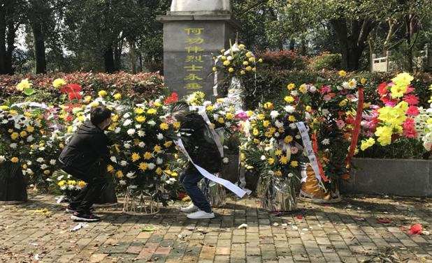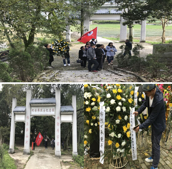 下午两点半到达墓区后,瞻仰了何功伟革命烈士纪念碑,追思先烈的丰功伟绩,然后排队整齐,庄严肃立,向何功伟烈士敬献鲜花。