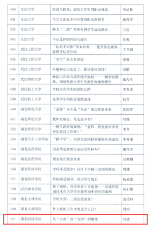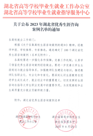 (通讯员:孙珏 审稿人:吴乐盈)近日,湖北省高等学校毕业生就业工作办公室、毕业生就业指导服务中心公布了“2023年湖北省优秀生涯咨询案例”,公司公司党委副书记刘波的生涯咨询案例《从“言商”到“为国”的嬗变》入选,该案例也是公司唯一入选案例。