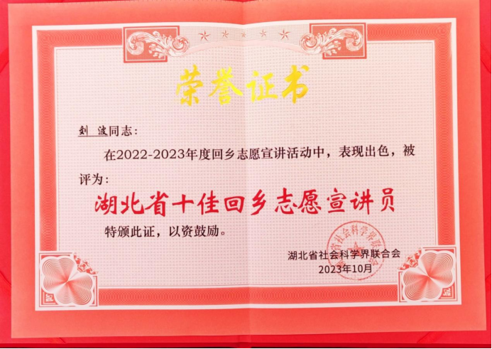 (通讯员:王晶;审稿:吴乐盈)2023年10月13日,在湖北秭归举办的湖北省社科普及工作推进会暨省社科普及骨干培训班上,公司党委副书记刘波副教授被湖北省社科联评为2022-2023年度湖北省“十佳”回乡志愿宣讲员。